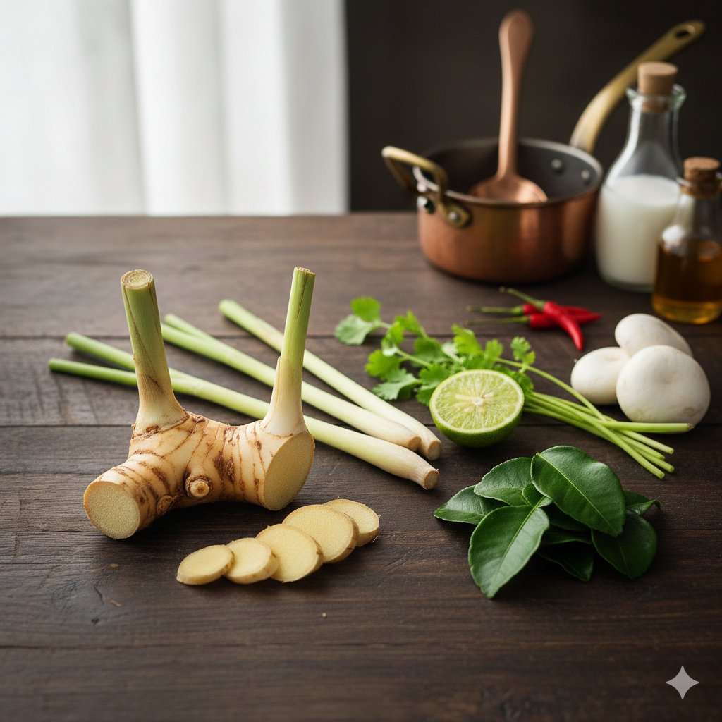 Galgant, Zitronengras und Kaffir-Limettenblätter sind mehr als nur Aromastoffe – sie sind die Seele thailändischer Suppen.