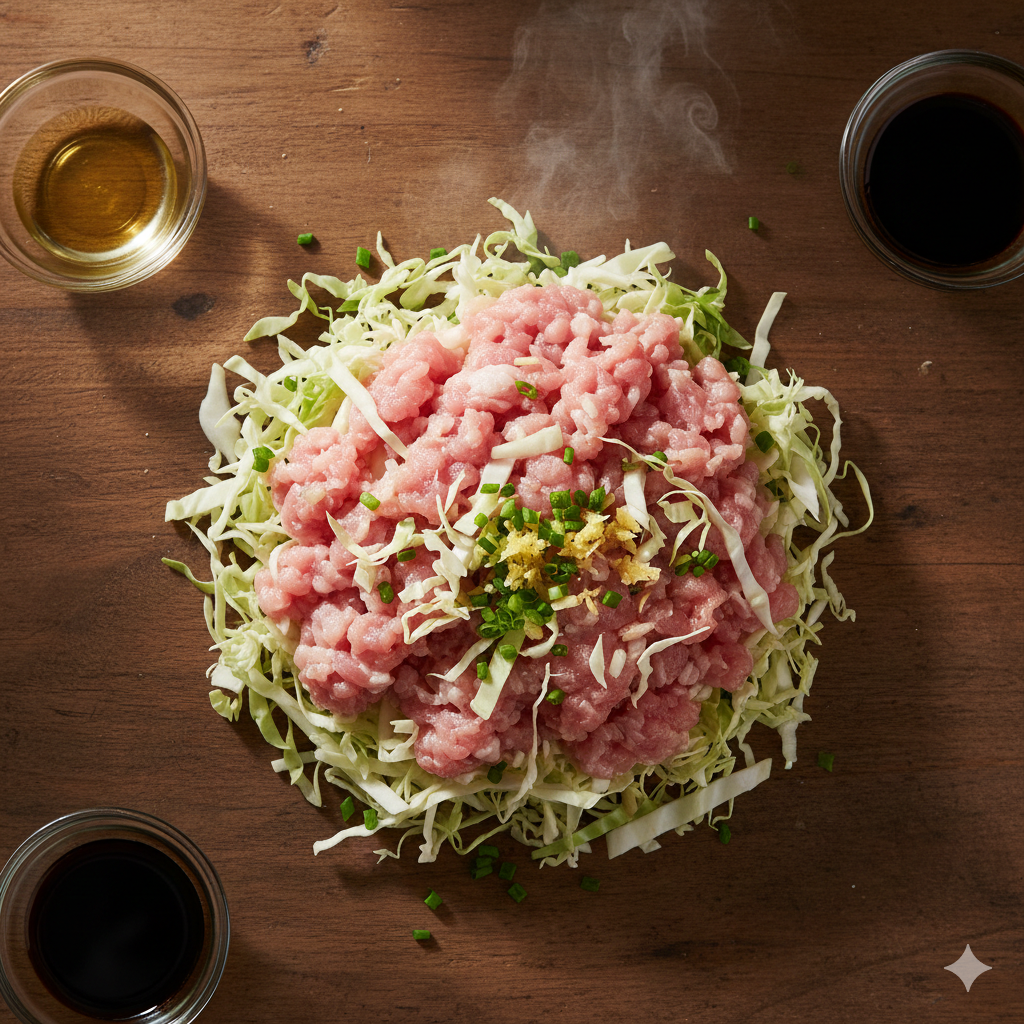 Nun kommt der entscheidende Schritt: alles homogen vermengen. Fleisch, Kohl und Gewürze in einer großen Schüssel vorsichtig, aber gründlich mischen. Tipp: Mit den Händen arbeiten, um die Textur zu prüfen und sicherzustellen, dass die Füllung gut zusammenhält. Sie sollte saftig sein, aber nicht tropfen – nur so lassen sich perfekte Gyoza formen, die beim Braten oder Dünsten nicht aufplatzen.