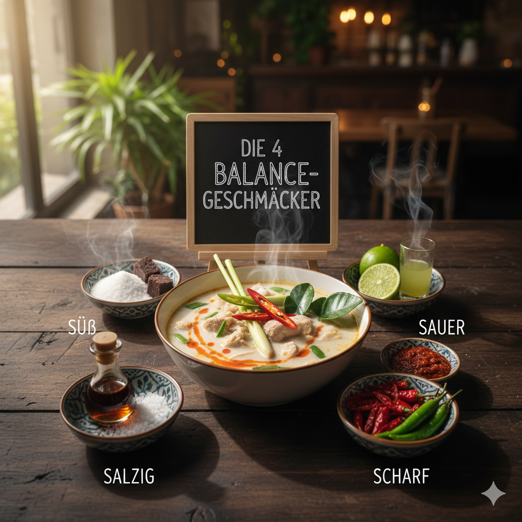 In Thailand ist eine Suppe kein starres Rezept. Sie ist ein System. Ein Spiel mit vier Geschmäckern, die ständig miteinander verhandeln: süß, sauer, salzig und scharf. Wenn eines davon dominiert, ist die Suppe nicht kaputt – sie ist einfach nicht fertig.