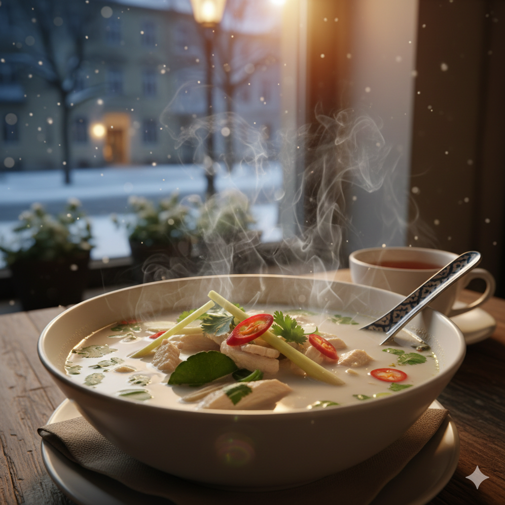 Es gibt viele Gründe, warum Tom Kha Gai gerade im Winter zu einem Lieblingsgericht der Berliner geworden ist. Zum einen ist da die Wärme: Die cremige Kokosmilch, kombiniert mit der leichten Schärfe von Galgant und Chili, wärmt den Körper von innen und vertreibt den Winterblues. Zum anderen ist die Suppe leicht, aber sättigend – perfekt für lange Spaziergänge durch die verschneiten Straßen oder nach einem Tag voller Besorgungen in der Stadt.